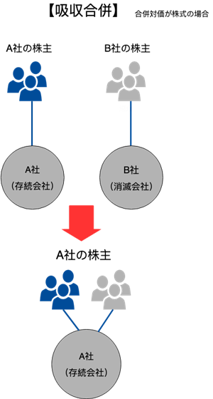 一方の会社が、他方の会社を吸収する形の合併です。吸収する側の会社を存続会社、吸収される側の会社を消滅会社といいます。吸収合併では、消滅会社の持っていた権利や義務はすべて存続会社に承継され、消滅会社は解散することになります。吸収合併では、消滅会社の株式は消滅することになるため、消滅会社の株主は、株式の対価として、存続会社の株式・社債・現金等を受け取ることができます。